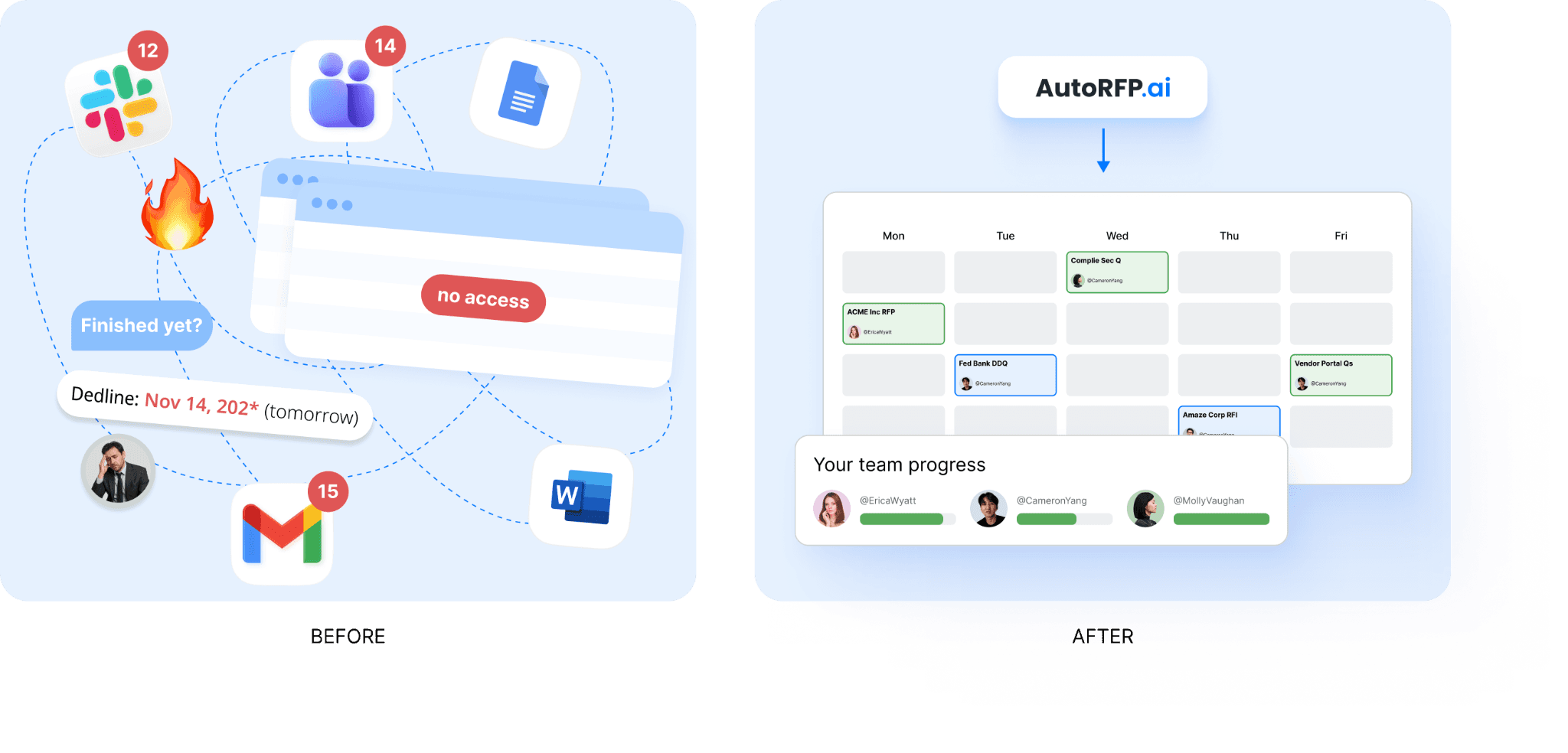 AutoRFP.ai helps teams manage complex RFPs, RFIs, DDQs, and security questionnaires from one central dashboard.
