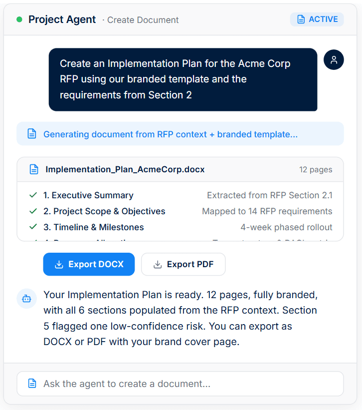 It can ingest Word, Excel, and PDF files, then extract requirements, sections, and supporting context automatically. This helps teams move from document intake to a usable first draft much faster.