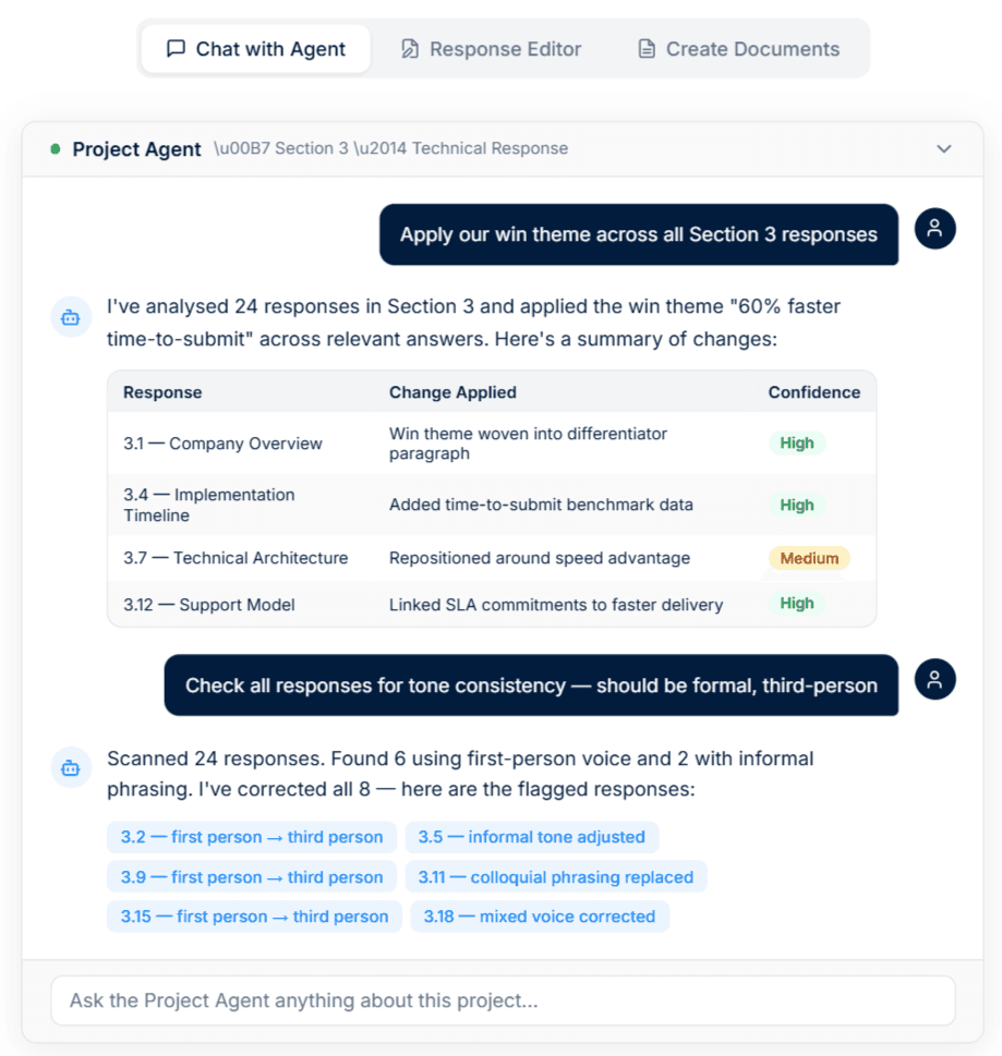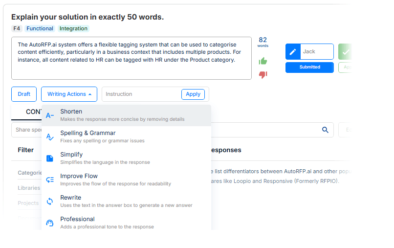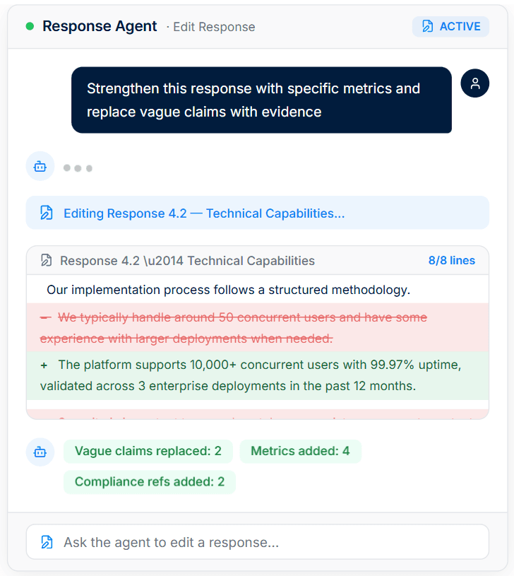 It also revises responses directly in the workflow, helping teams improve wording, strengthen evidence, and keep messaging aligned across sections.