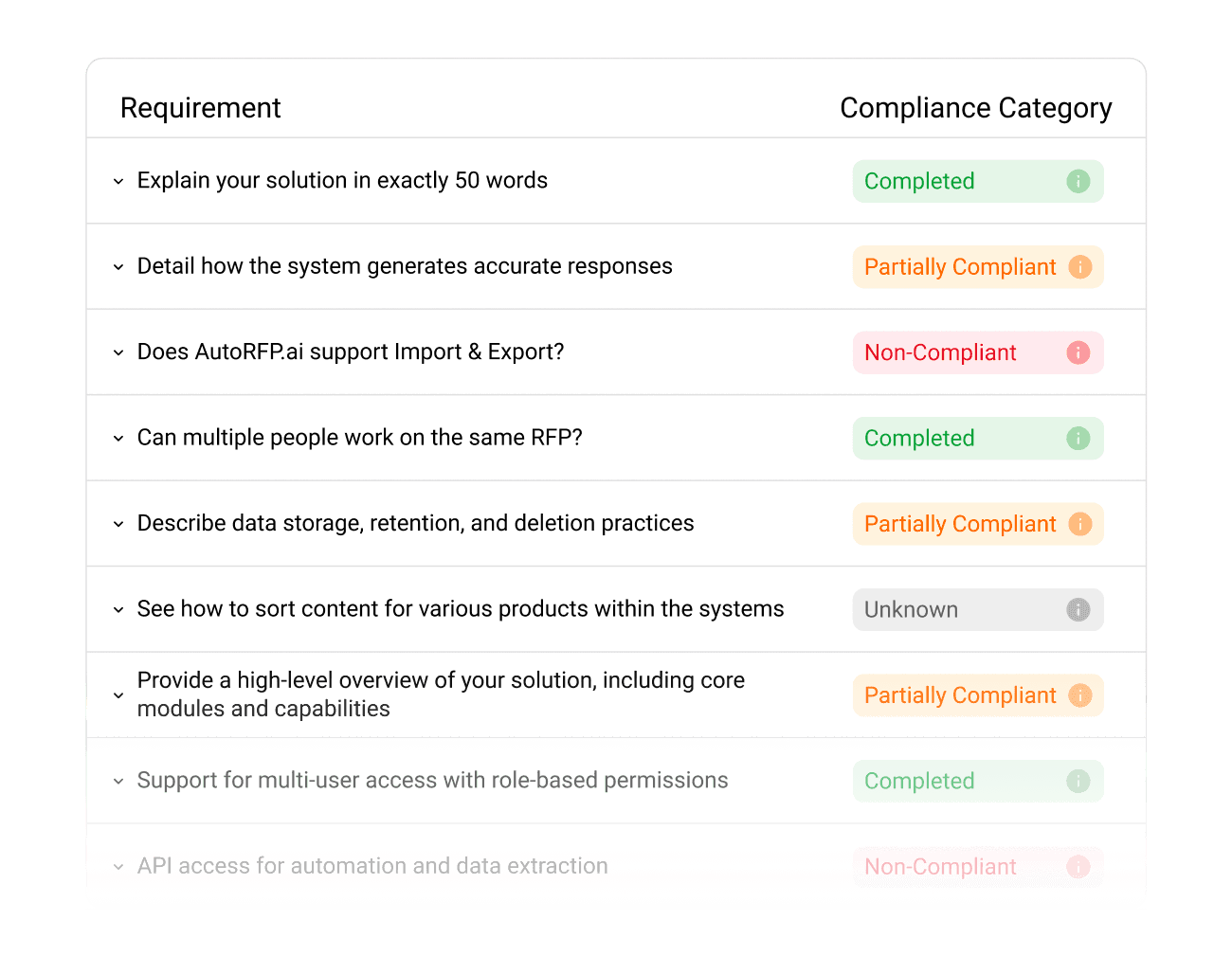 AutoRFP.ai helps here by tracking compliance answers across your response history with no setup, no tagging, and no manual work. That makes it easier to spot patterns, understand what is blocking deals, and turn those insights into stronger responses, better product priorities, and smarter bid decisions.