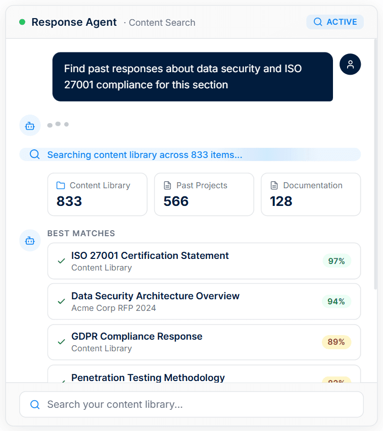 It searches across your content library, previous projects, and uploaded documents to find approved content that fits each requirement.