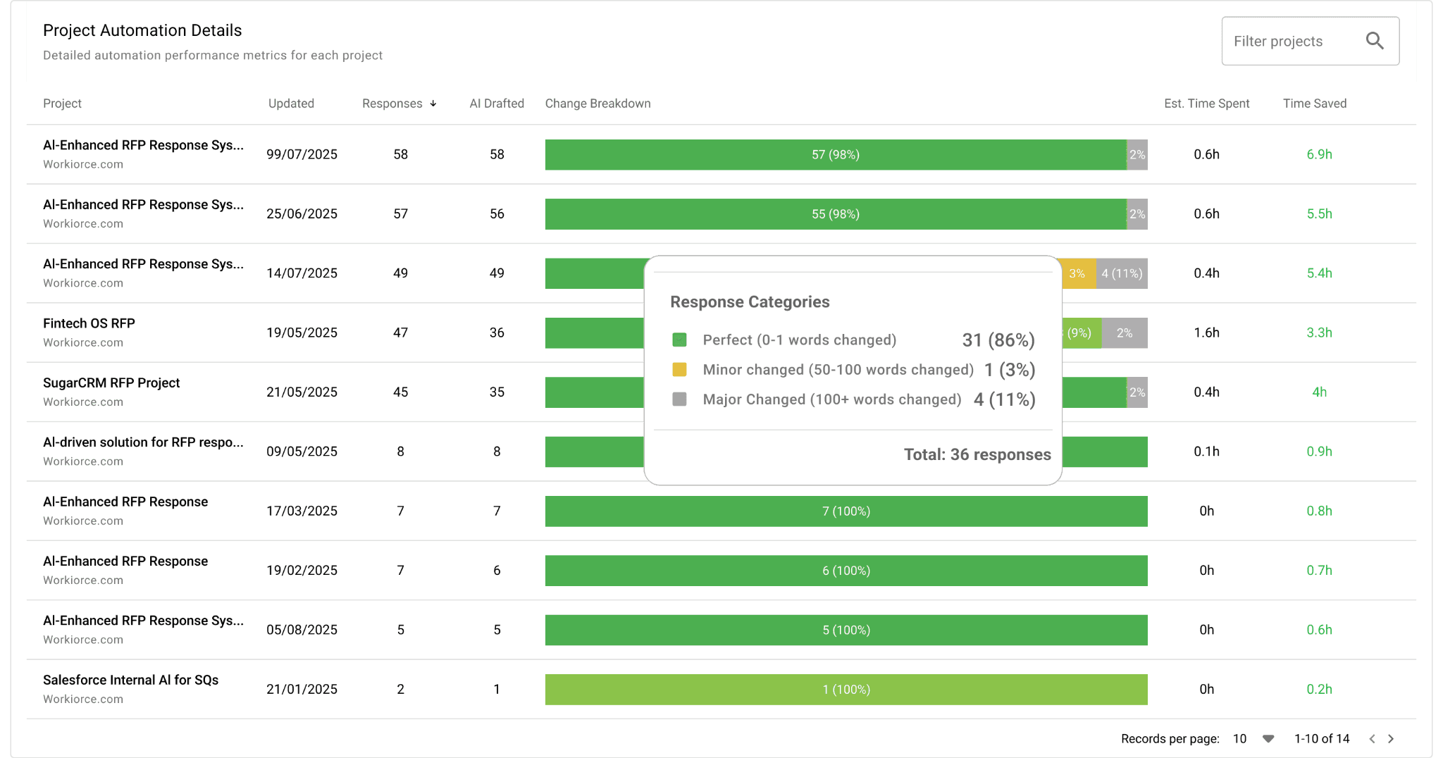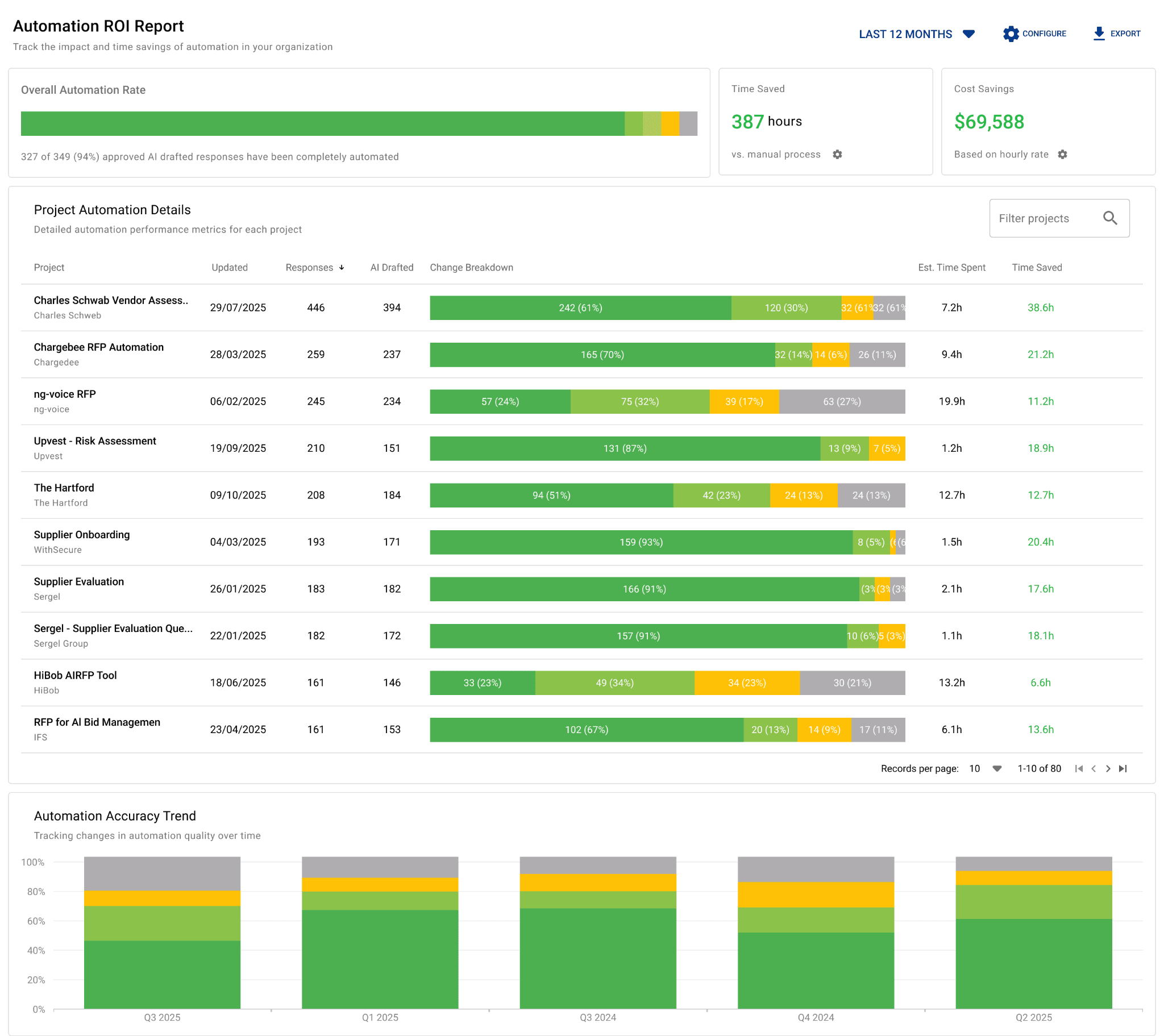 AutoRFP.ai does this well with ROI reporting that automatically tracks automation rate, cost savings, team efficiency, capacity freed by person, response type breakdowns, and quarterly accuracy trends across completed projects. That gives teams the data they need to prove real return on investment, not just talk about speed.