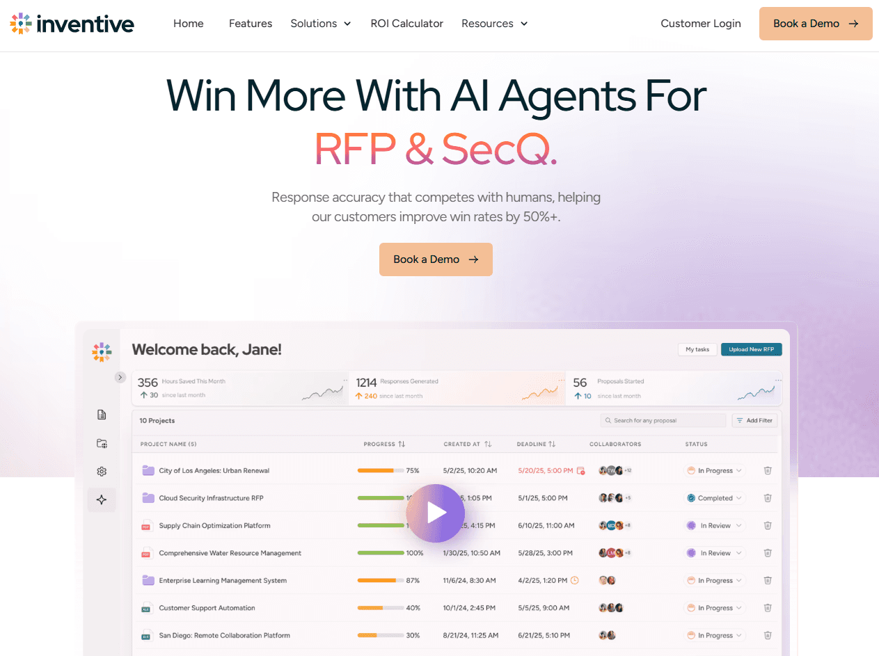 Inventive.ai is one of the most AI-native tools in this category. Instead of leaning mainly on library search, it positions itself around an AI RFP agent, context-aware drafting, freshness checks, narrative proposal writing, and specialized agents for strategy work such as win themes and competitor research.