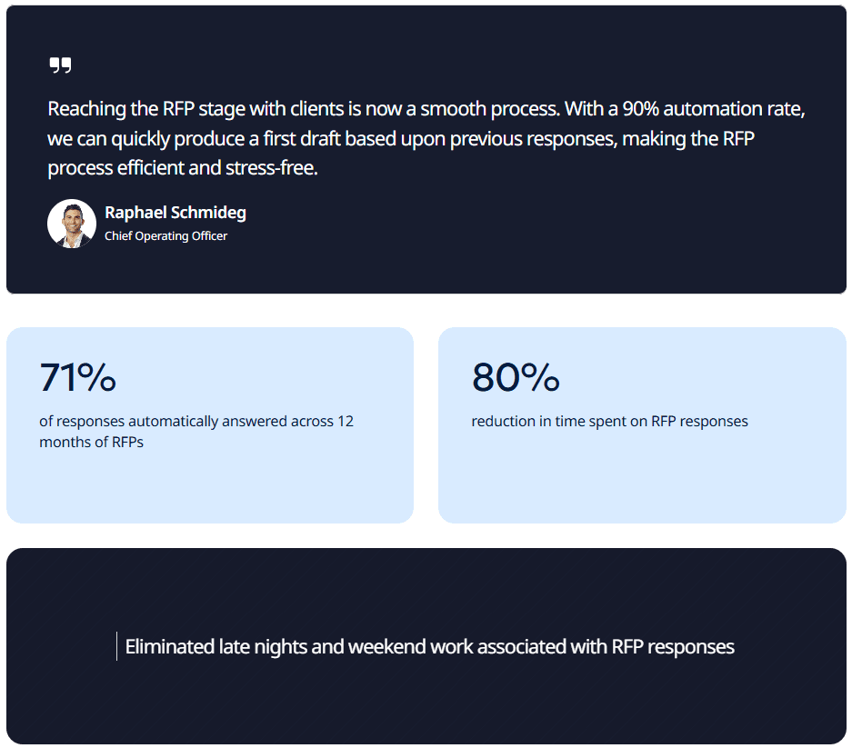 Raphael Schmideg, Chief Operating Officer at IMTC, said, “Reaching the RFP stage with clients is now a smooth process. With a 90% automation rate, we can quickly produce a first draft based upon previous responses, making the RFP process efficient and stress-free.”