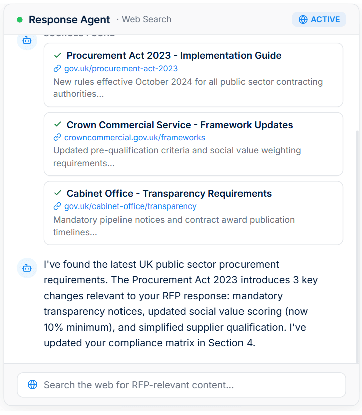 The agent can pull in live web information such as regulatory updates, industry data, and prospect-specific details to support stronger responses.