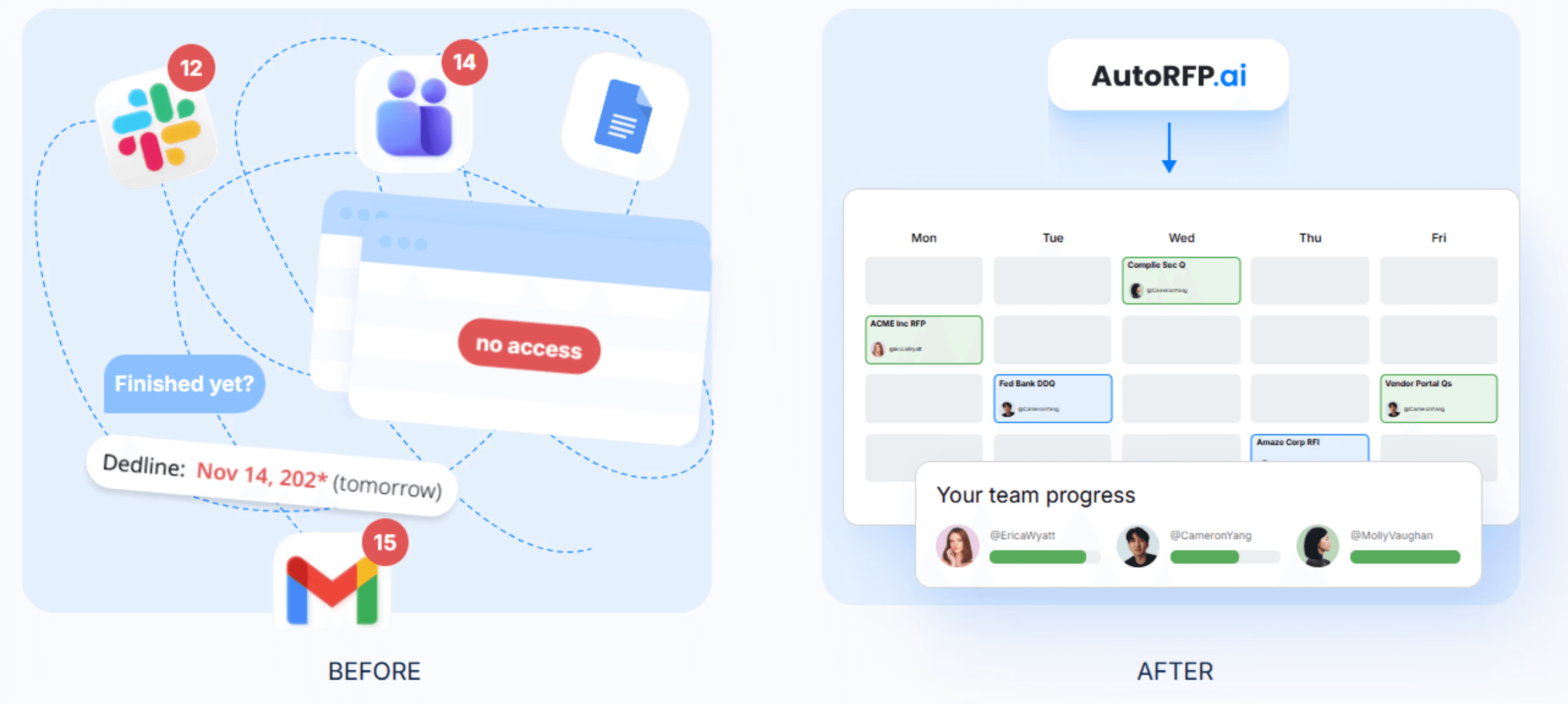 Unclear ownership & accountability | Errors slip through with no clear reviewer. | Assign a bid owner + named reviewers. With AutoRFP.ai, route sections, see who’s stuck, send reminders, and track status from one dashboard. |