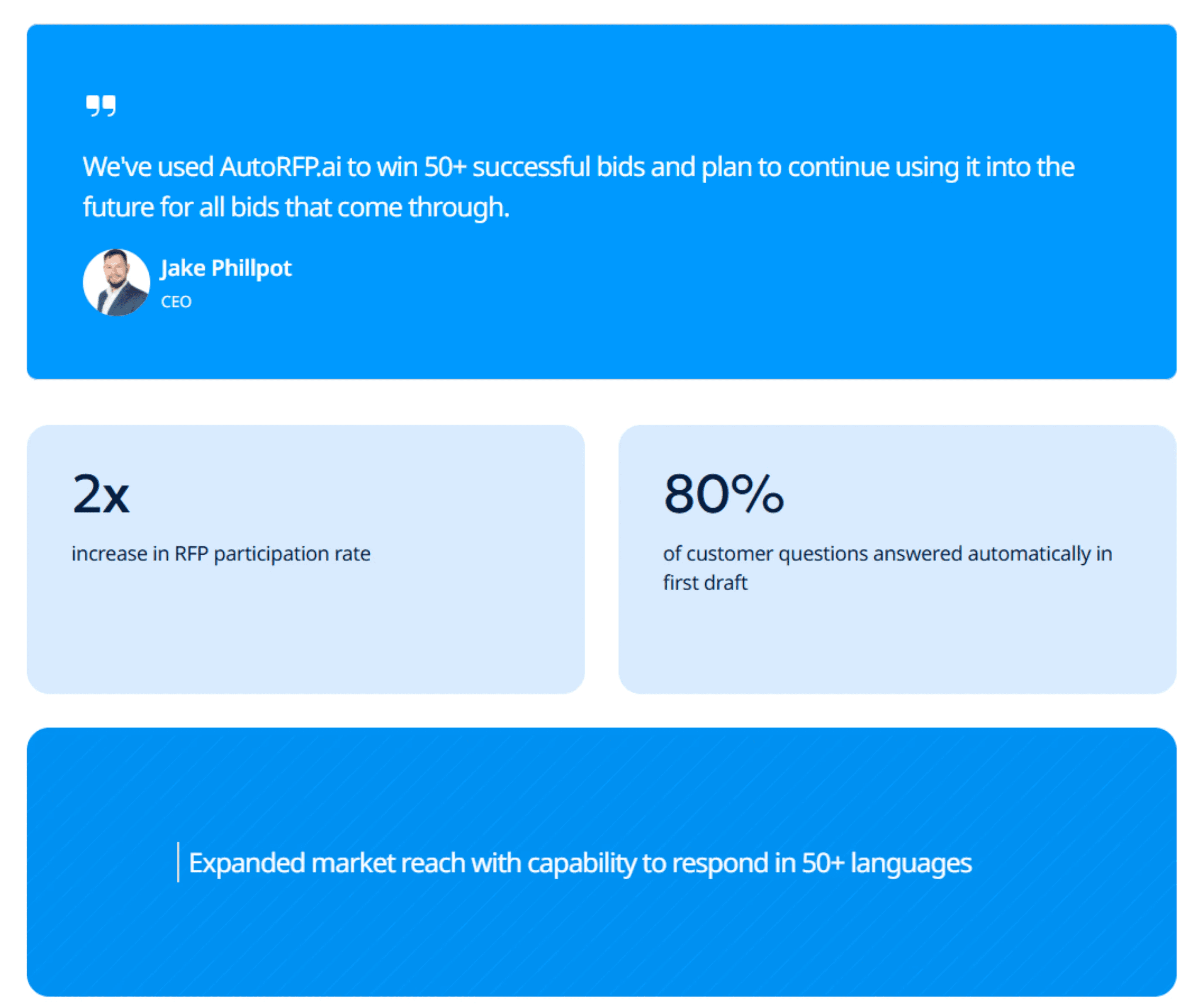 Jake Phillpot, CEO of Workforce, said, “We've used AutoRFP.ai to win 50+ successful bids and plan to continue using it into the future for all bids that come through.”