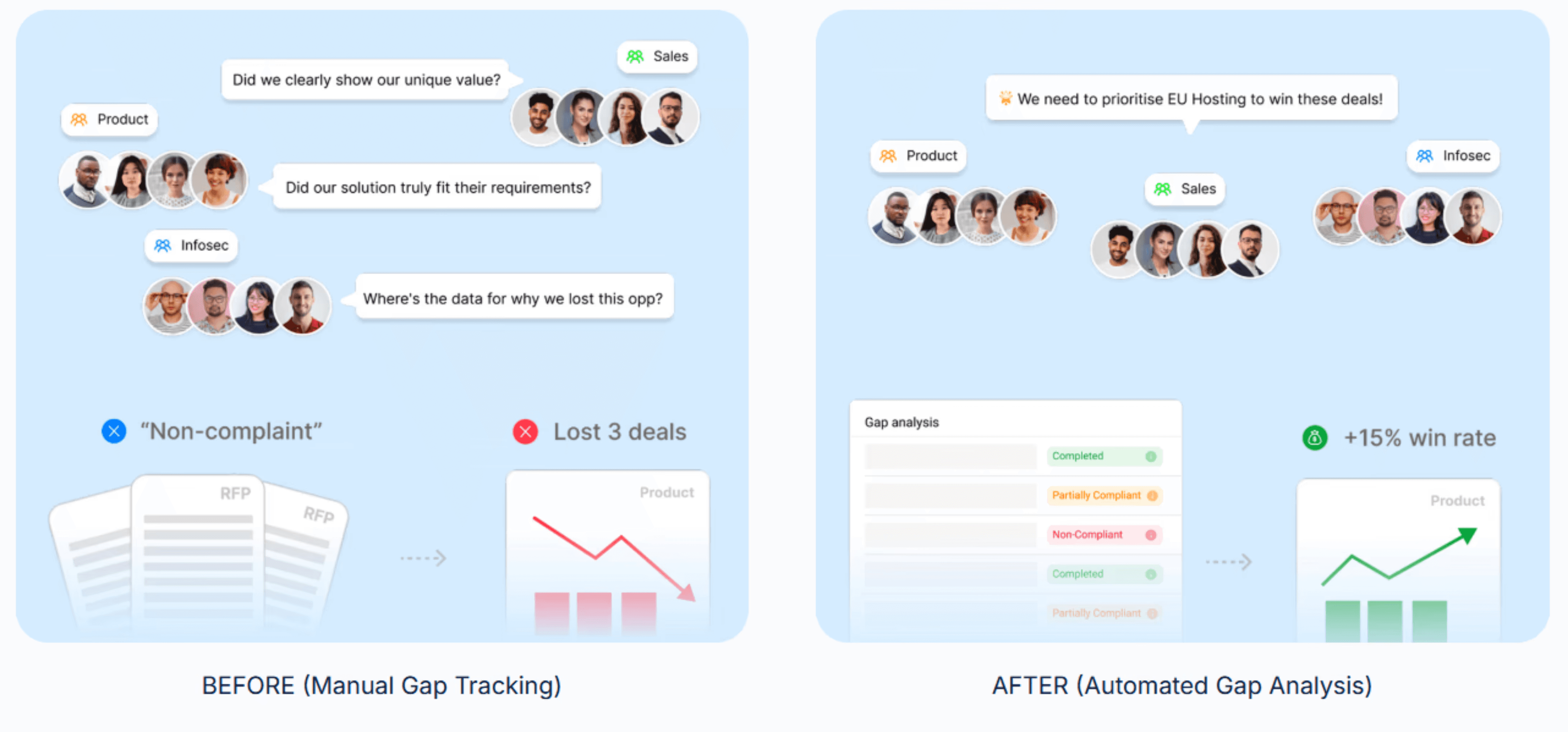 Document analysis and planning | Manual reading to pull scope, deadlines, criteria, and risks, then planning happens across docs and threads. | AI extracts requirements and evaluation criteria, highlights priorities, and helps shape win themes and a response outline earlier. |