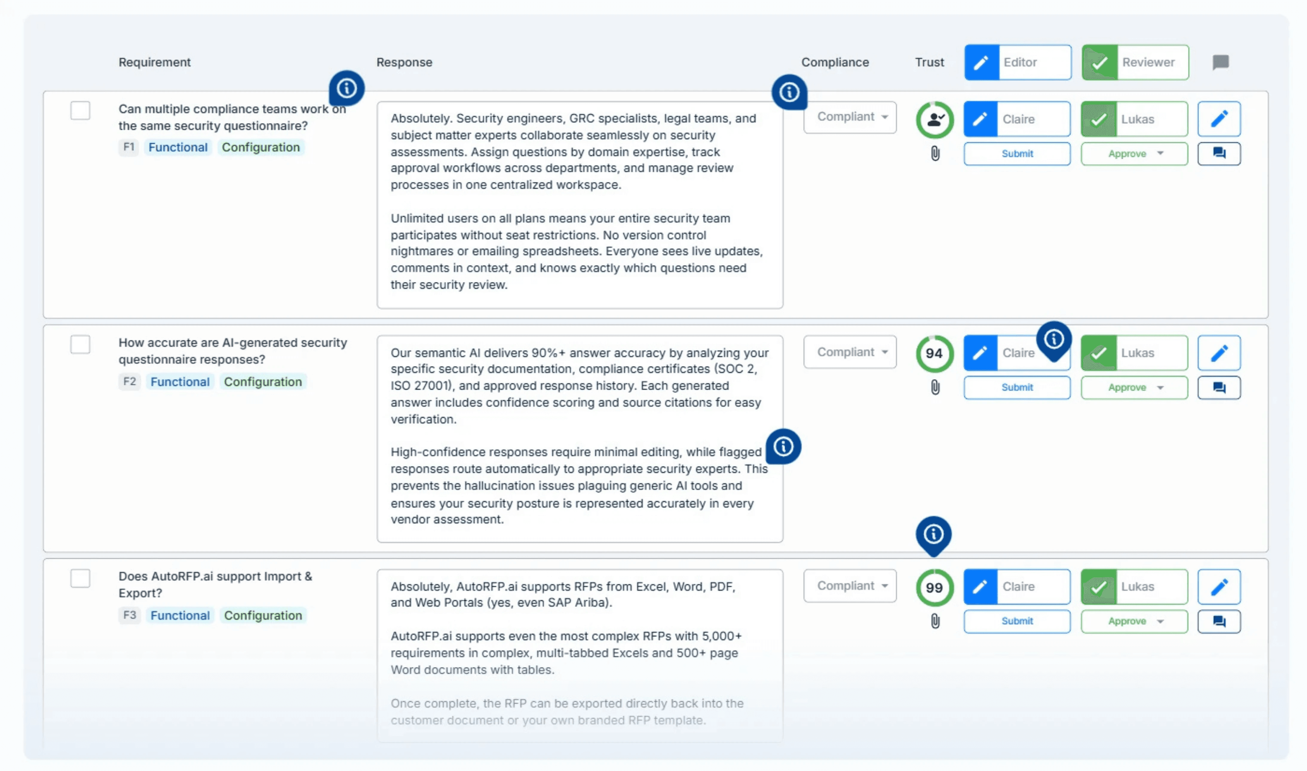 More reuse, less rework | Reuses approved content for repeat questions, so your bespoke effort goes into the sections that actually differentiate you. |