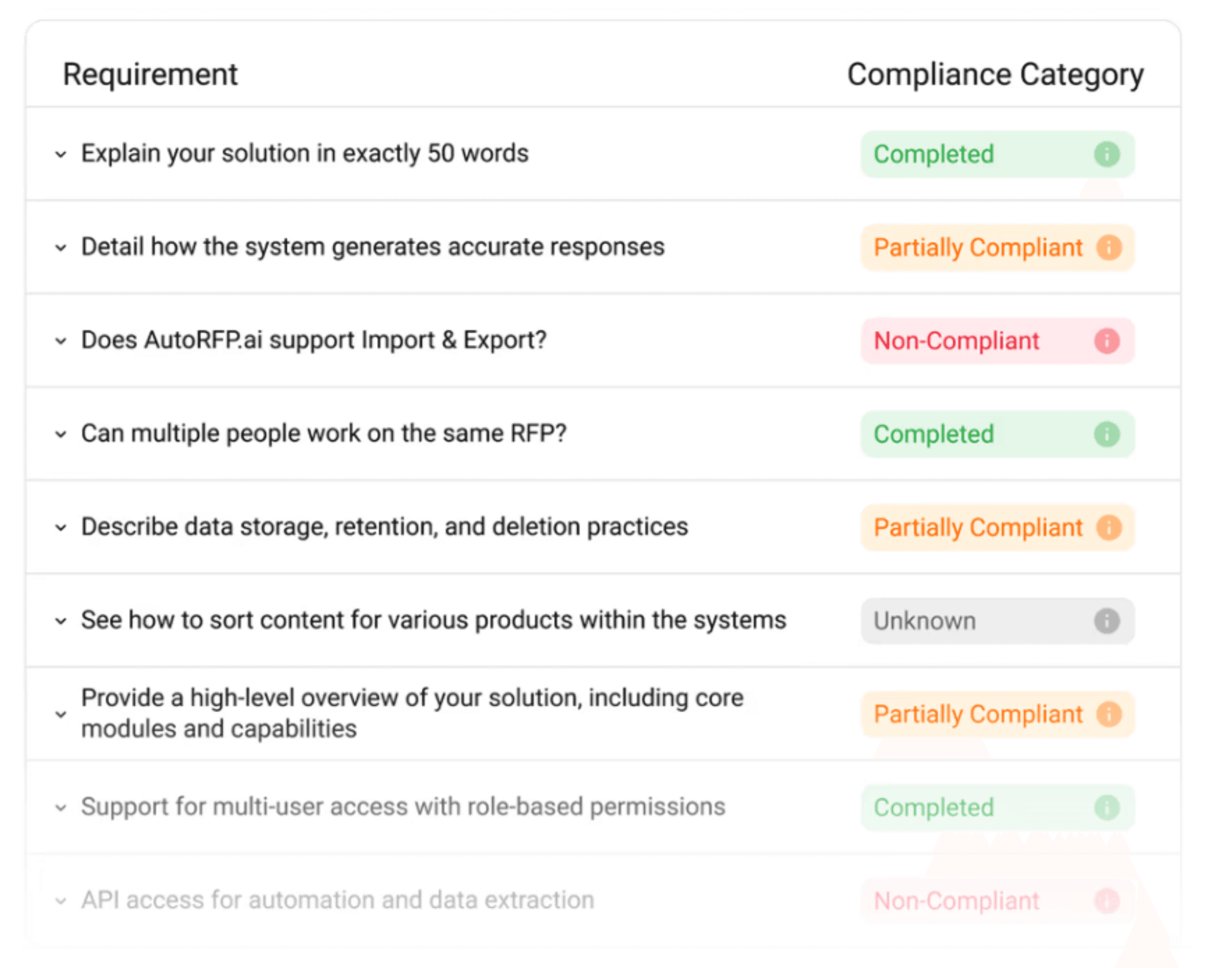 Pro tip: See compliance patterns across all RFPs in AutoRFP.ai to track which requirements you consistently fail without digging through old responses or building spreadsheets.