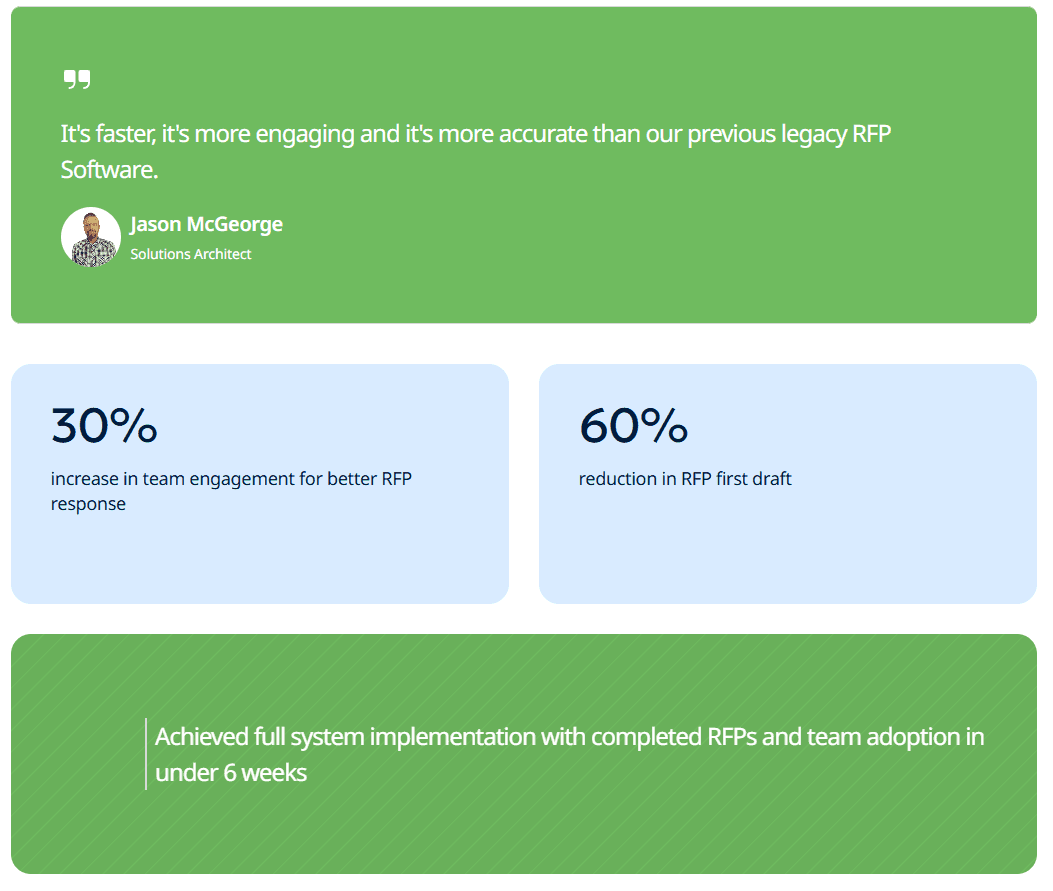 Jason McGeorge, Solutions Architect at ecoPortal, said, "It's faster, more engaging, and more accurate than our previous legacy RFP software."
