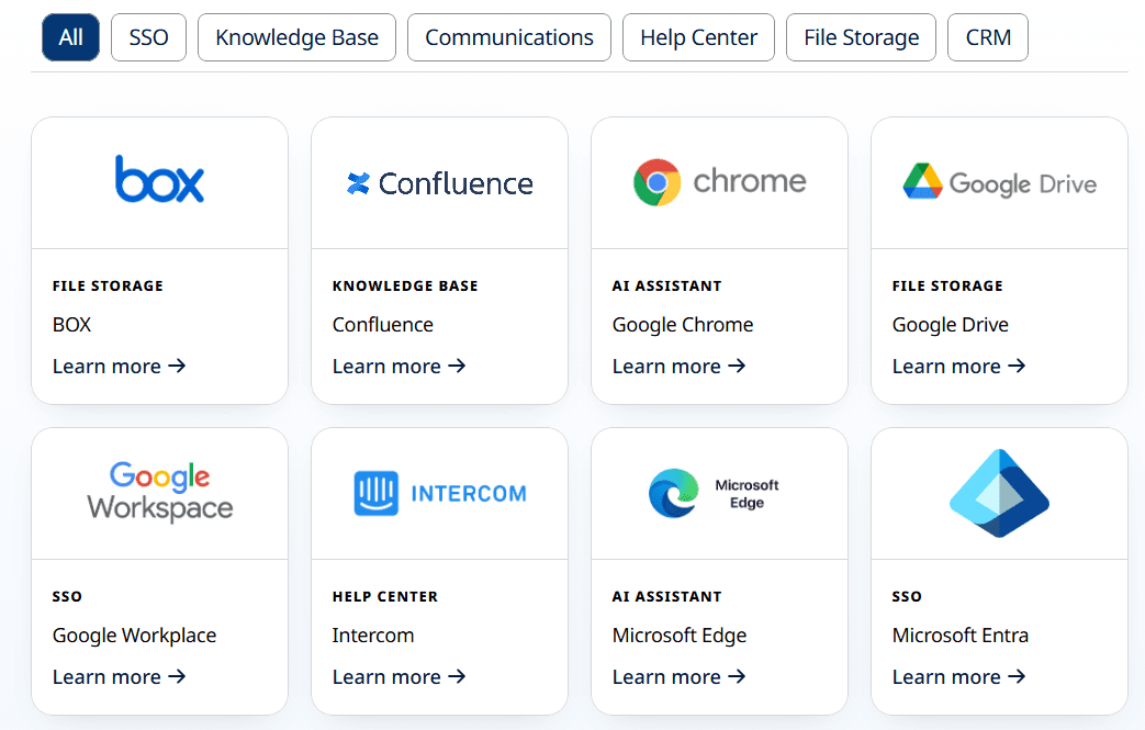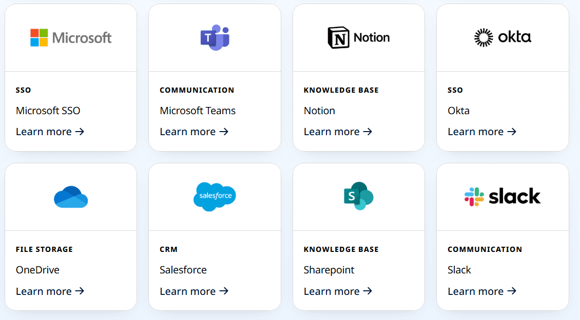 It supports tools like Google Drive, Confluence, Salesforce, Slack, and Teams, so teams can work without jumping between disconnected systems.