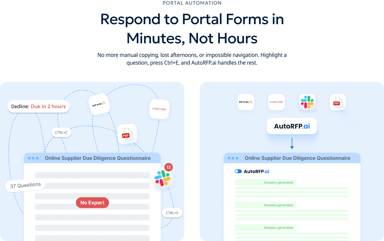AutoRFP.ai scrapes questions from portal-based questionnaires, generates answers from your library, and exports them back automatically for platforms like Ariba, UpGuard, and Jaggaer.
