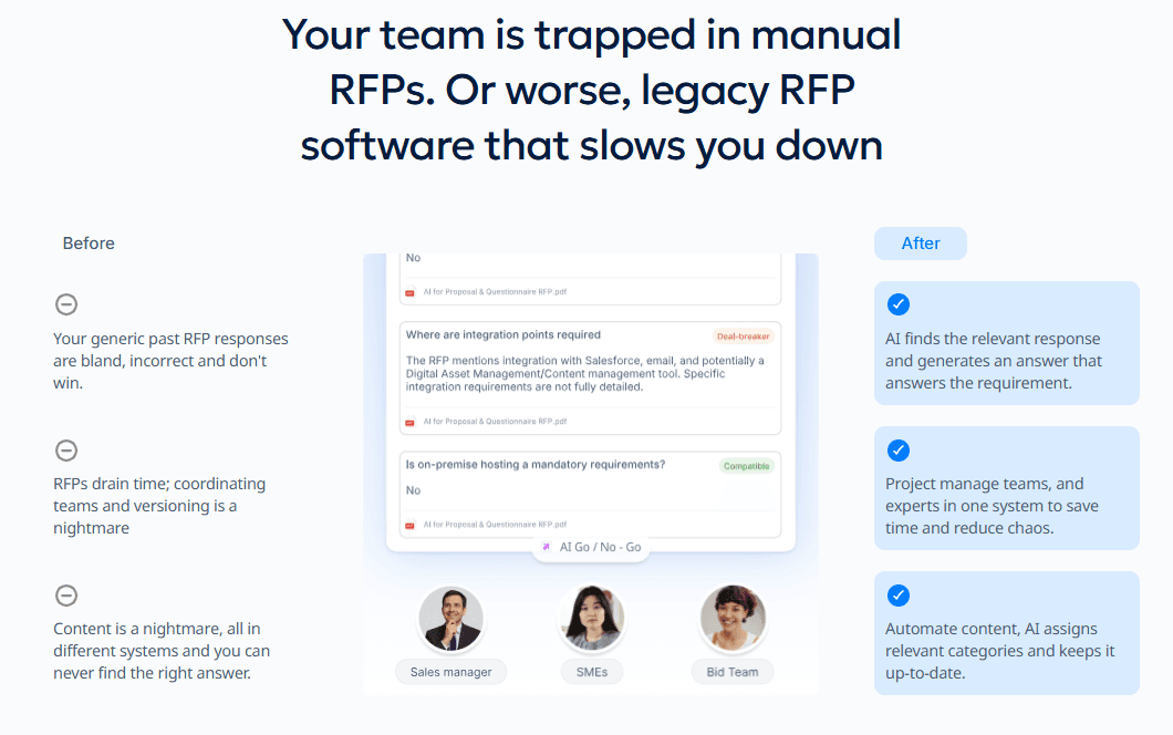 RFP project management: Track progress in one dashboard, see who is stuck, send reminders, and keep SMEs accountable. No more spreadsheets, email chains, or daily status meetings.