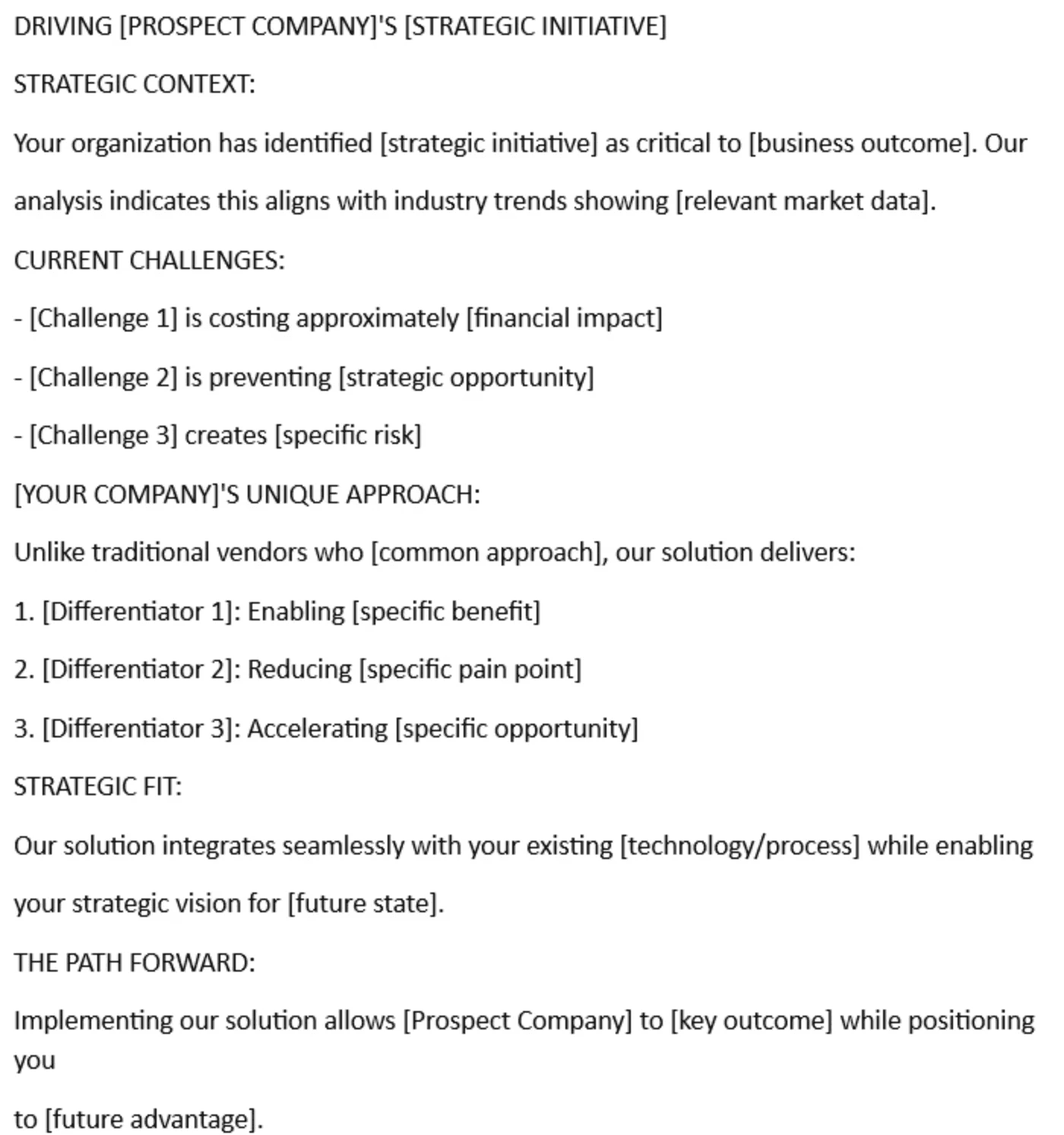 It differentiates your approach without naming competitors and connects your proposal to their strategic initiatives and future benefits.