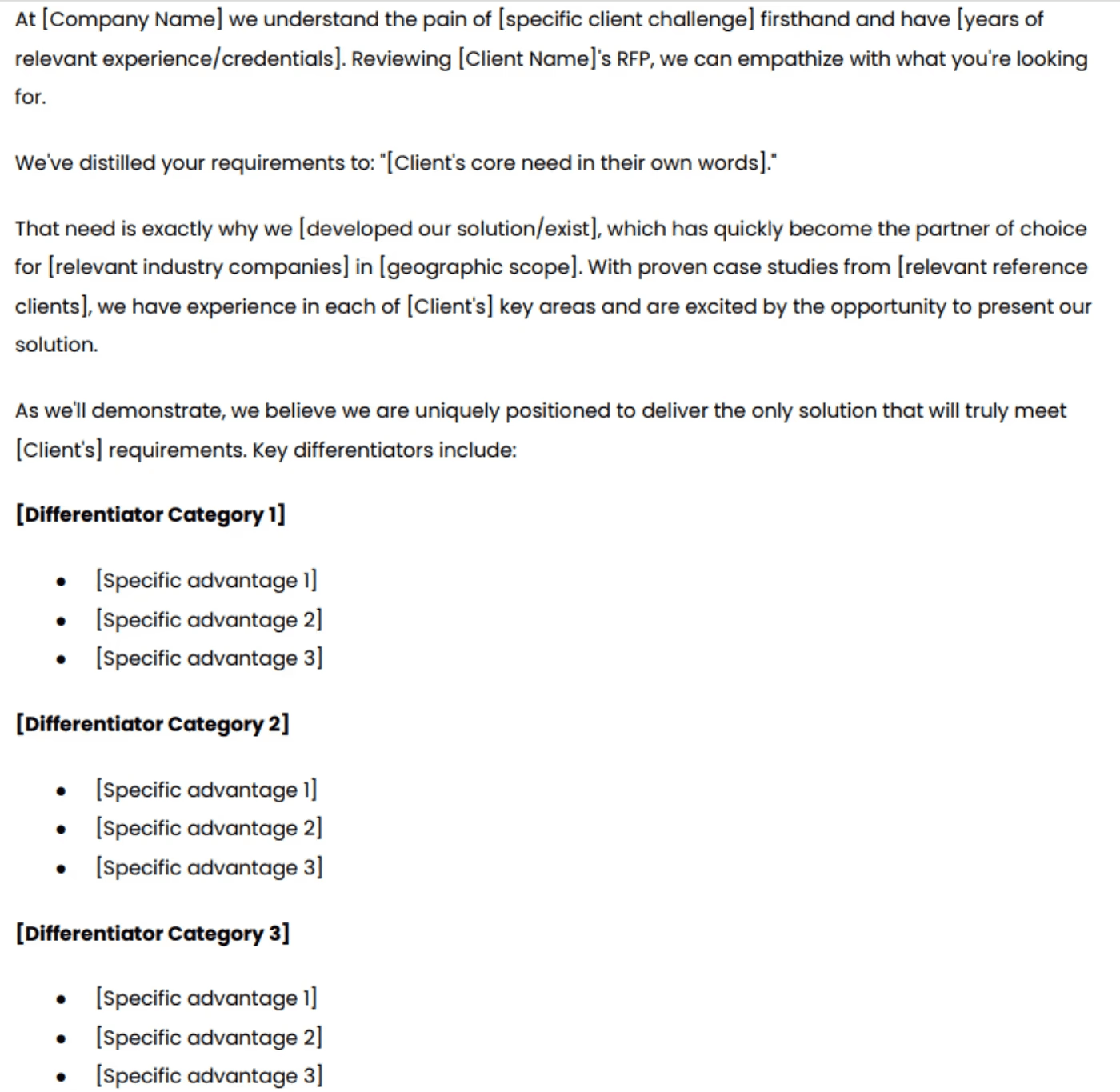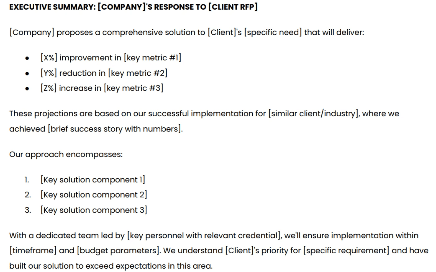 Here are ready-to-use RFP executive summary examples and templates you can reference for your own: