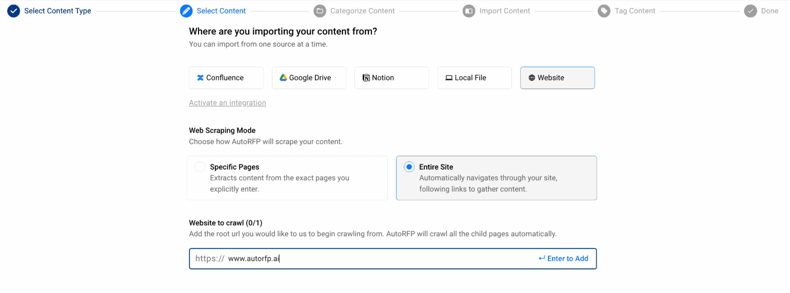 Example of AutoRFP.ai importing content from a website, with options to scrape specific pages or automatically crawl the entire site and turn it into library content.