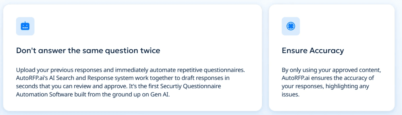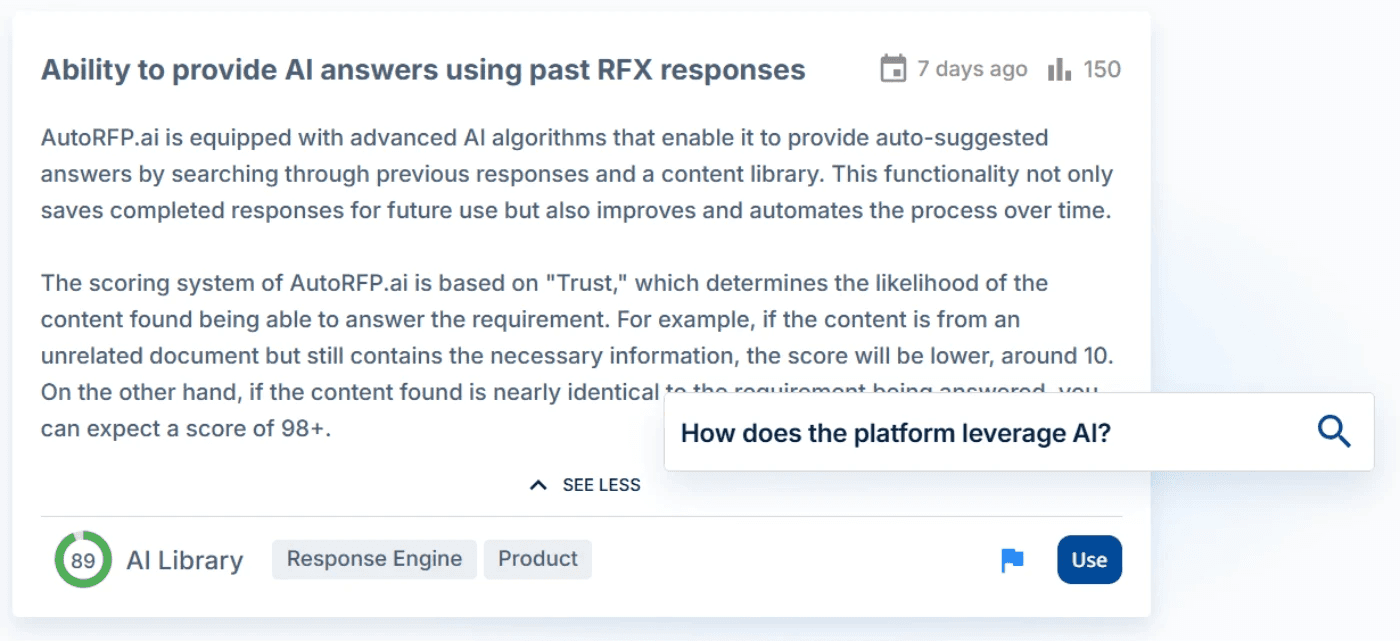 A structured RFP library feeds AI-powered RFP tools like AutoRFP.ai with trusted content, so the best answers are auto-suggested in seconds instead of being written from scratch.
