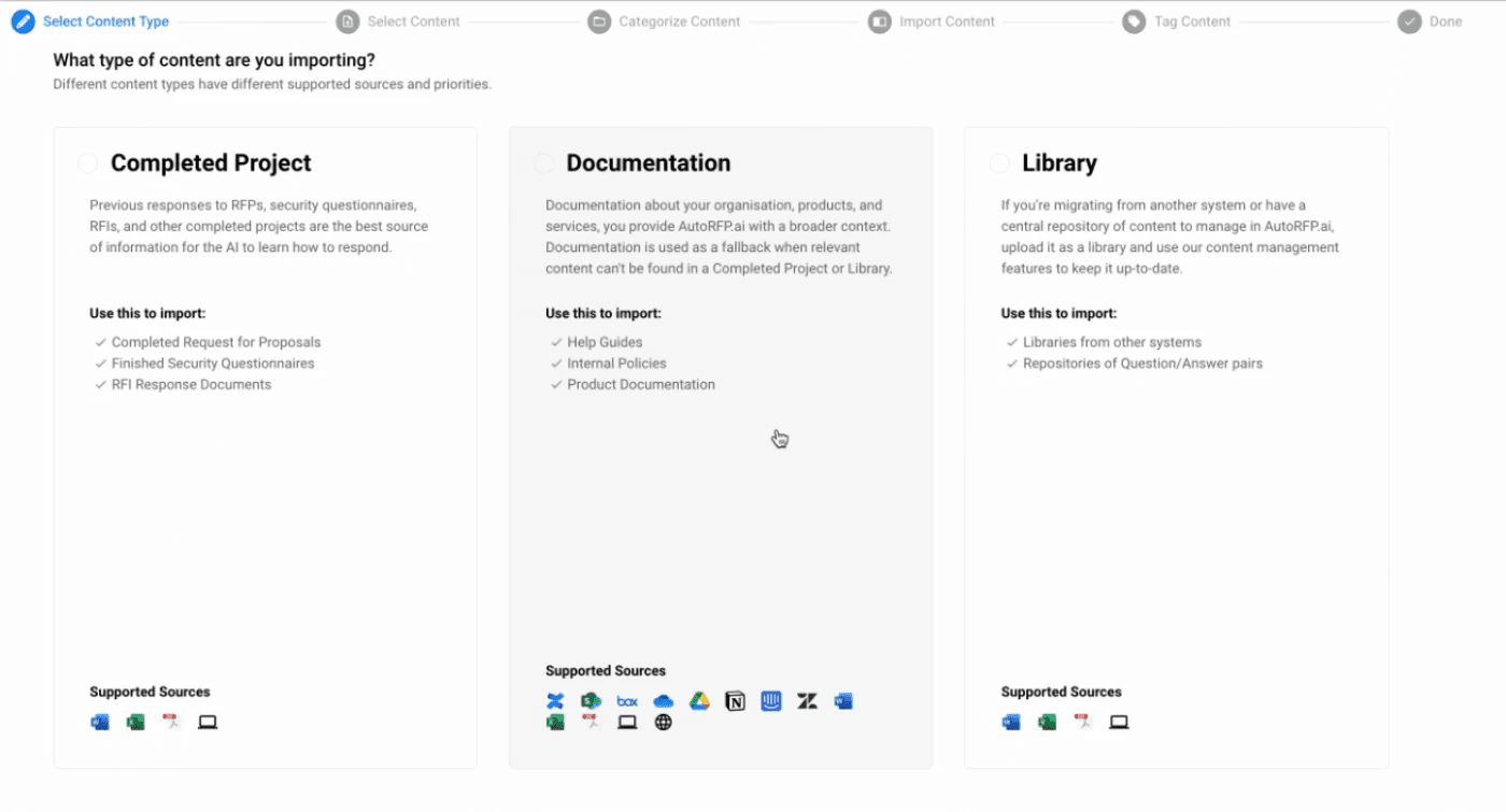 Example of AutoRFP.ai’s import, where you choose whether to import Completed Projects, Documentation, or an existing Library into your RFP content hub.