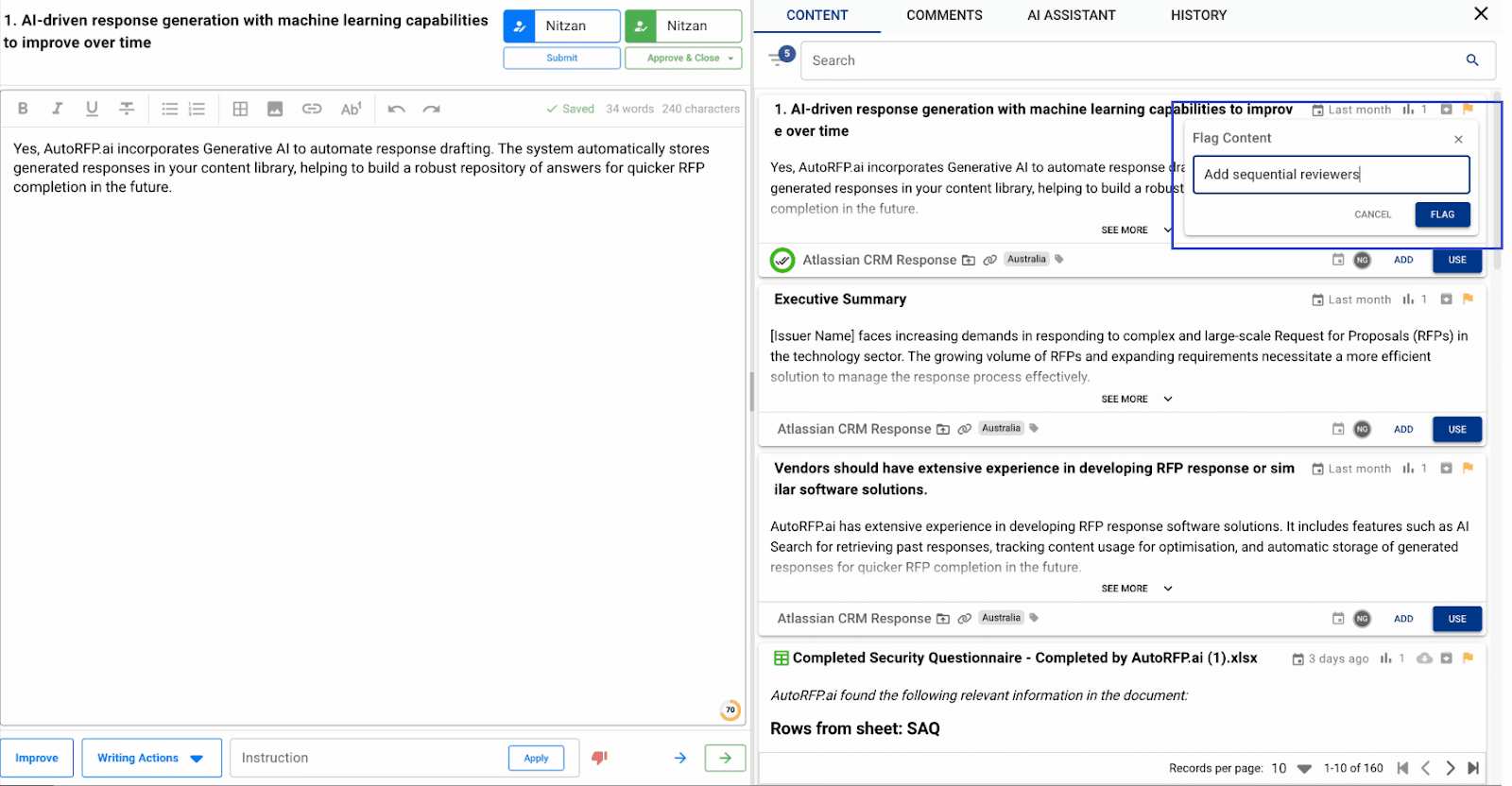 Example of flagging a response for review in AutoRFP.ai, with a note added so content owners know what to update in the library.