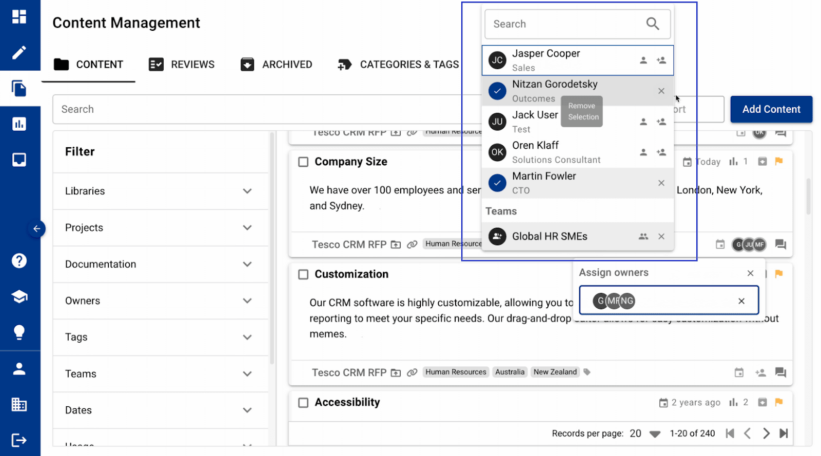 Example of assigning multiple content owners in AutoRFP.ai’s Content Management view
