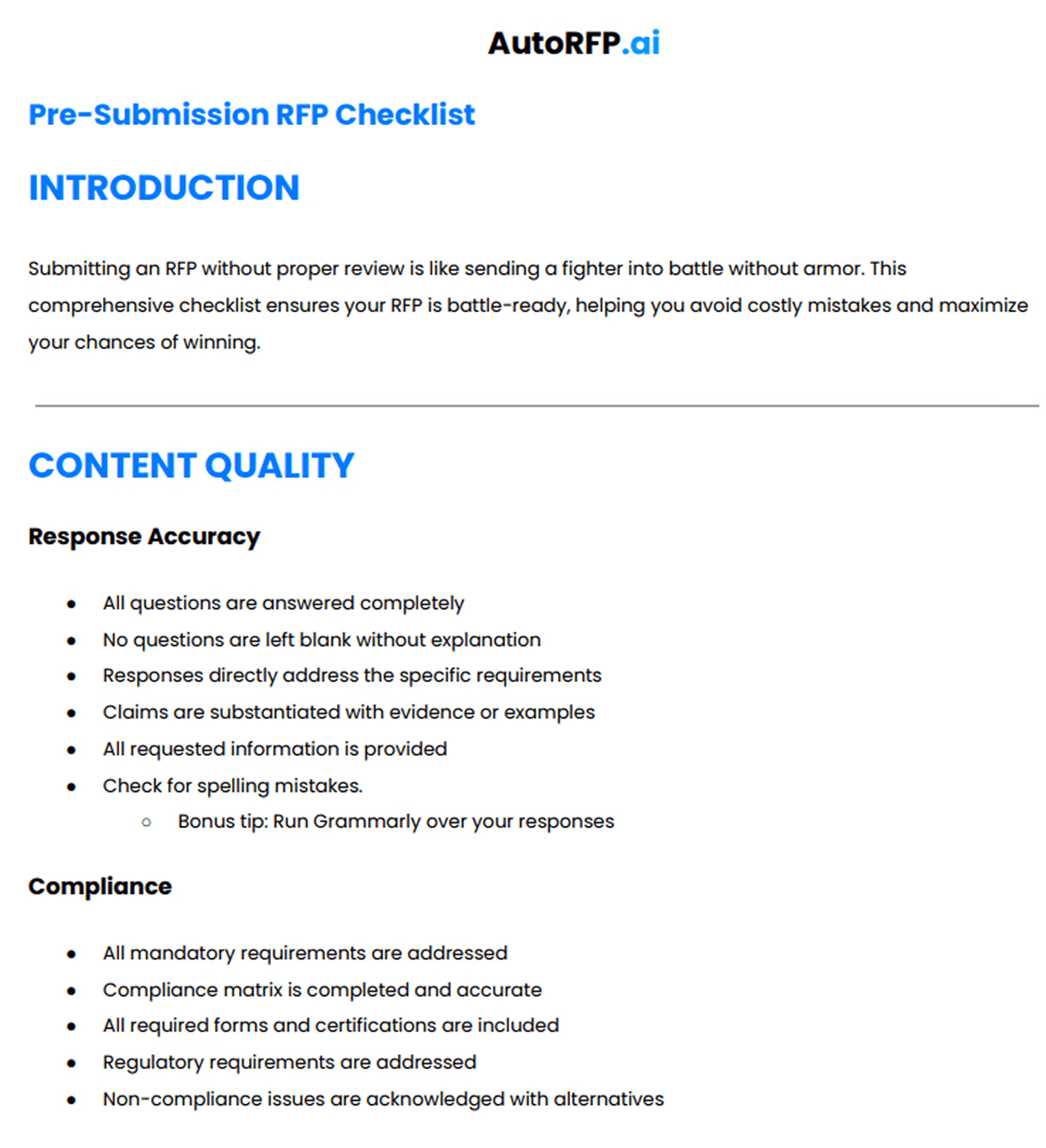 Use SMEs for validation, not first drafts | Let subject matter experts focus on accuracy and proof, while the proposal team keeps the response clear, consistent, and customer-focused. |