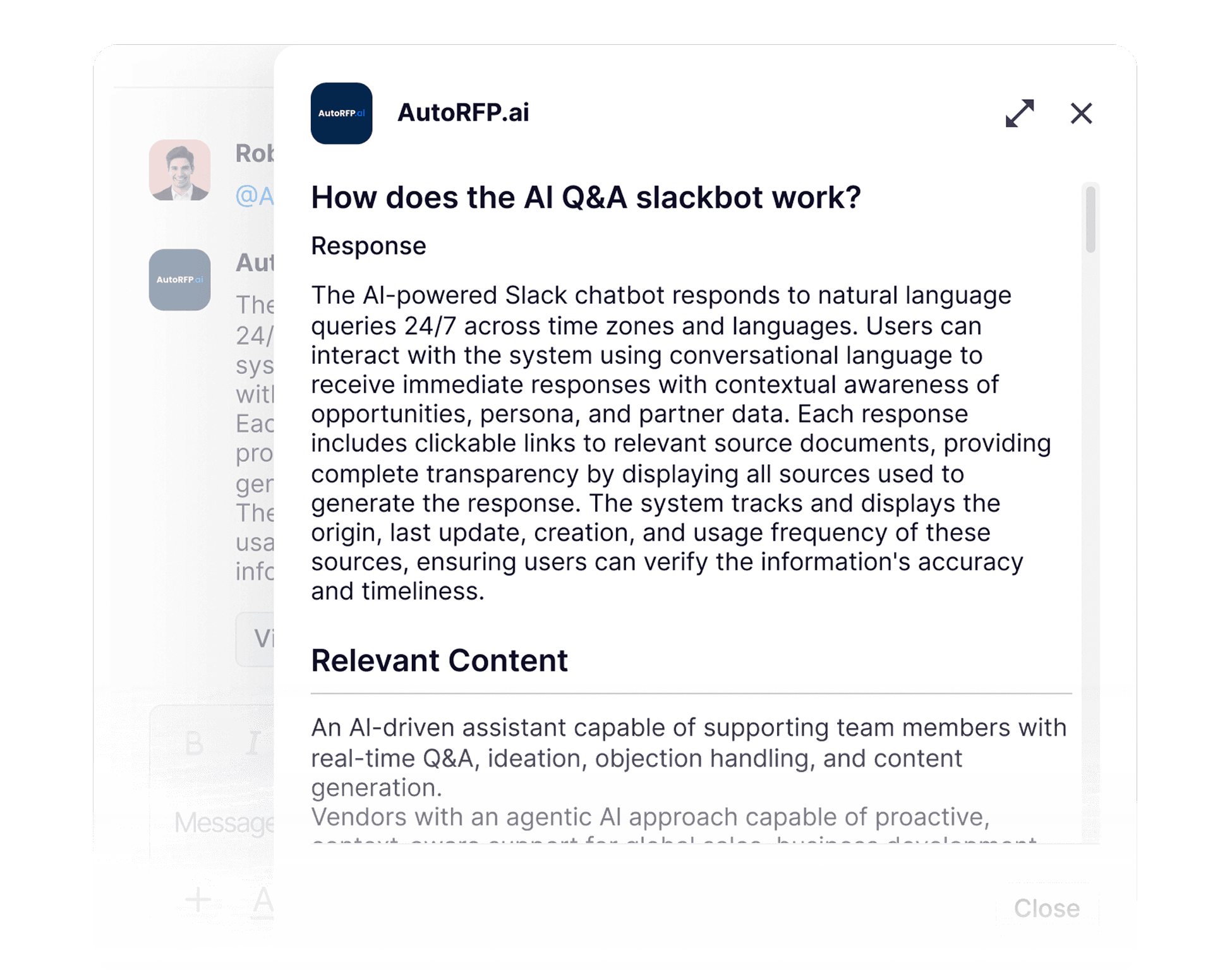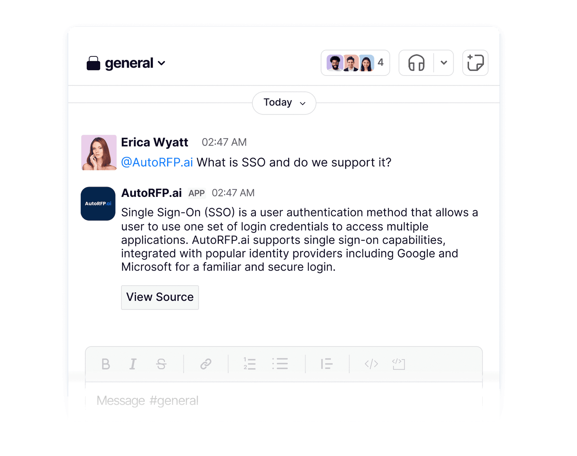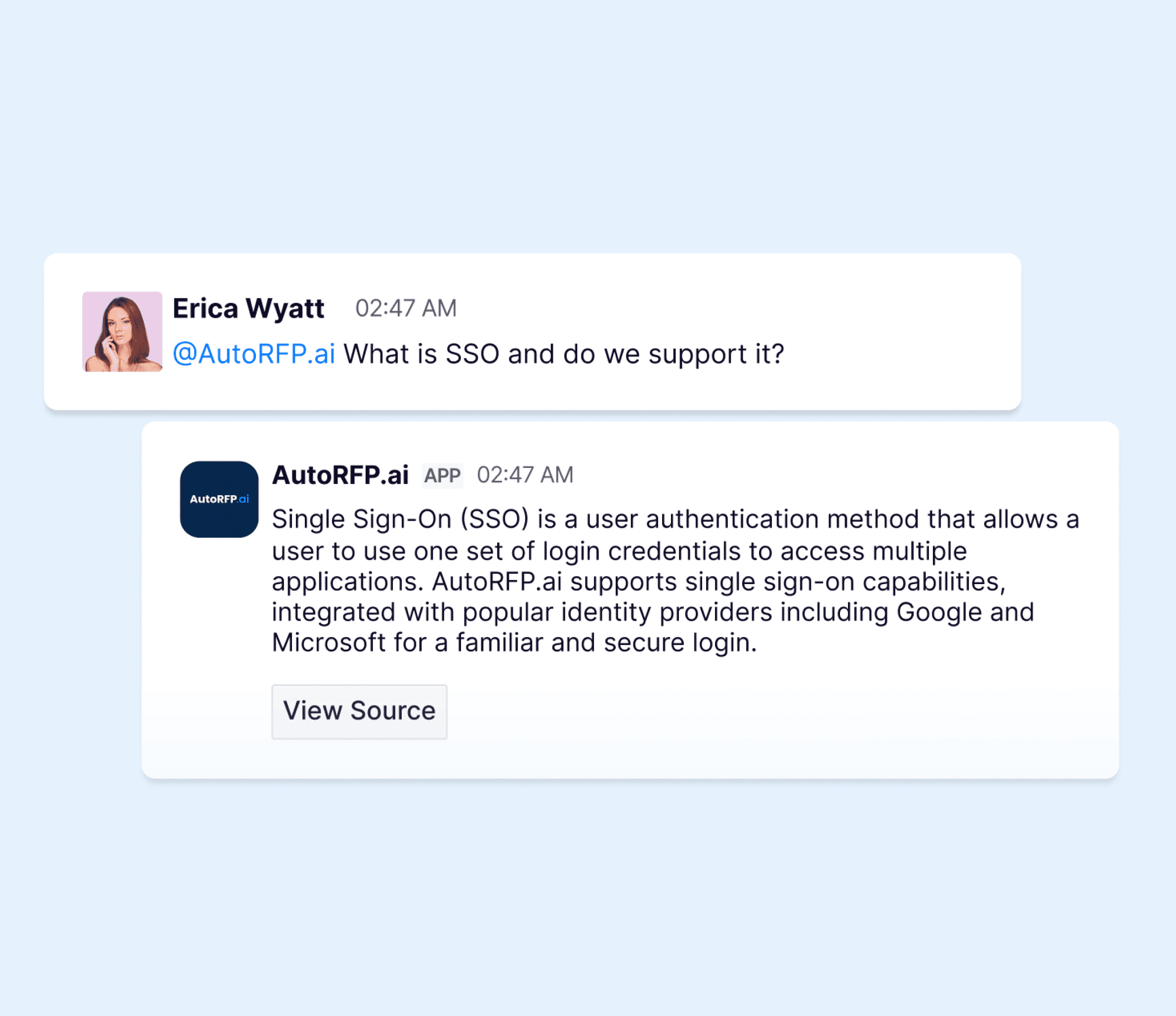 AutoRFP's AI Q&A bot integrates directly into Slack and Microsoft Teams, giving your entire team instant access to every past response, content library entry, and documentation - without leaving their conversation thread.