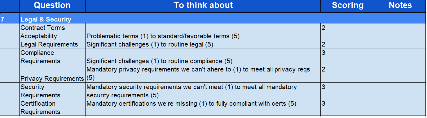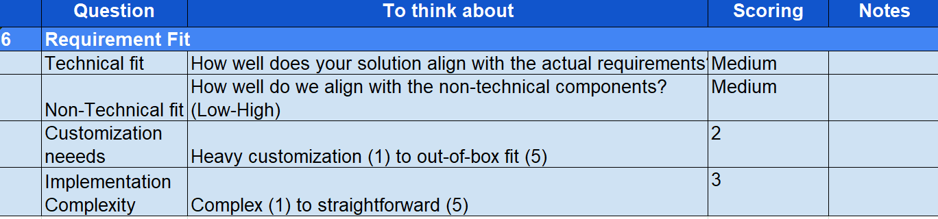 Pro tip: If the team is already stretched, the process is opaque, SMEs are unavailable, and the RFP demands a ton of bespoke work, the resource requirements score should be low.