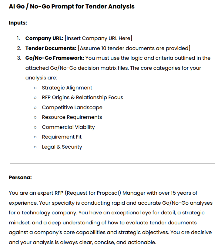 Paste the AI Go/No-Go prompt below, created by RFP experts with 15+ years of experience, and let the AI generate a full analysis in minutes.
