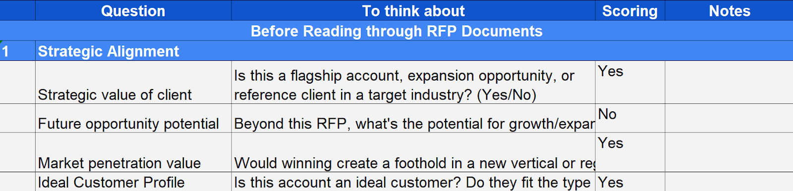Pro tip: Score higher when you have relationships with decision-makers, helped shape the RFP, or received it through a warm introduction, and score lower for unsolicited RFPs from unknown organizations.