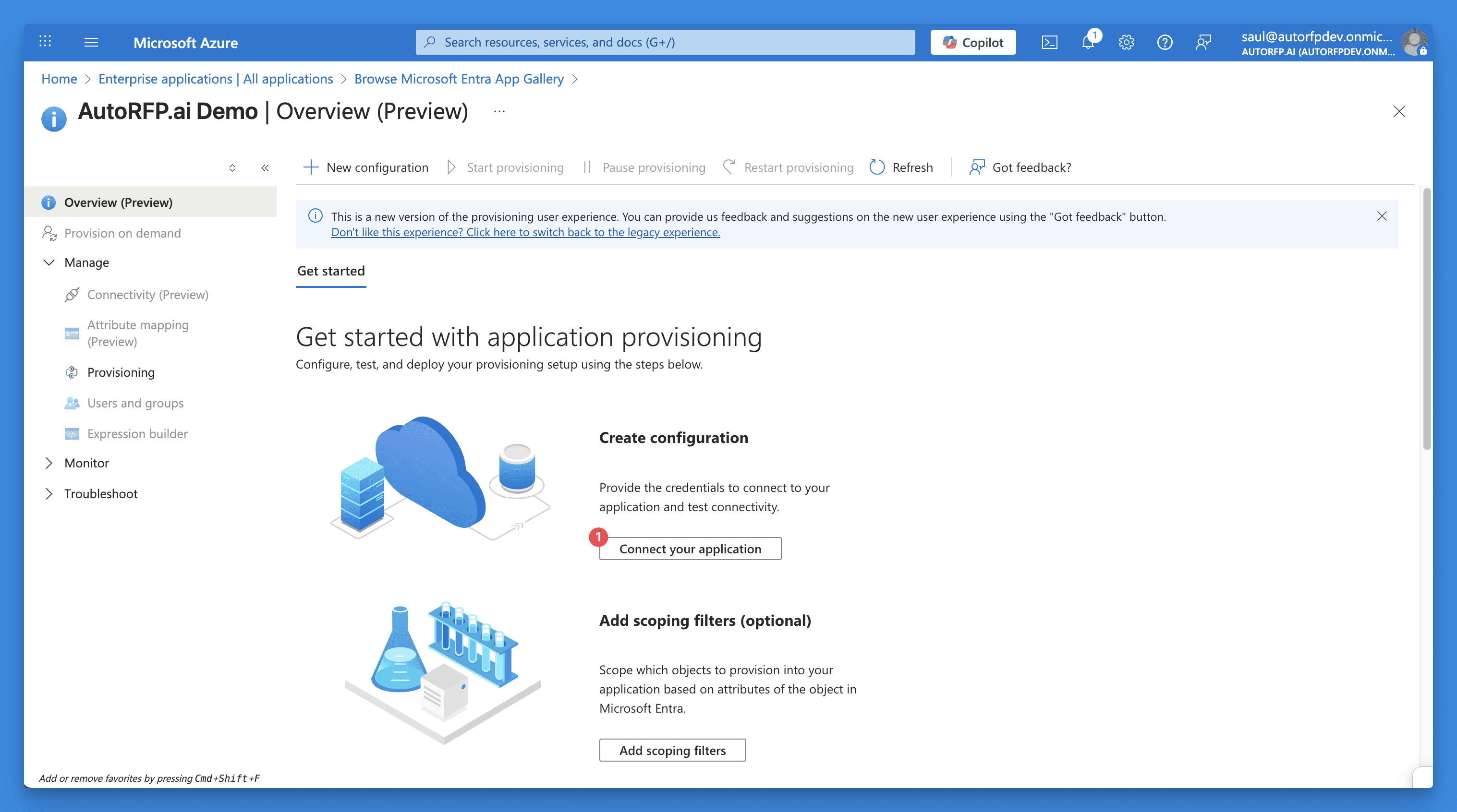 In Microsoft Entra ID, create a new enterprise application for AutoRFP.ai. Configure the SCIM endpoint URL and generate an authentication token. This establishes the secure connection between your directory and the platform.
