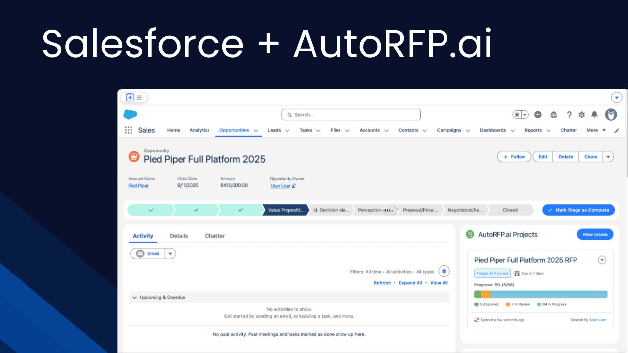 Install the AutoRFP.ai app from Salesforce AppExchange and enable the integration in your workspace settings. Add the AutoRFP.ai widget to your Opportunity and Account page layouts using Lightning App Builder. Your team starts creating and tracking RFP projects from Salesforce immediately.