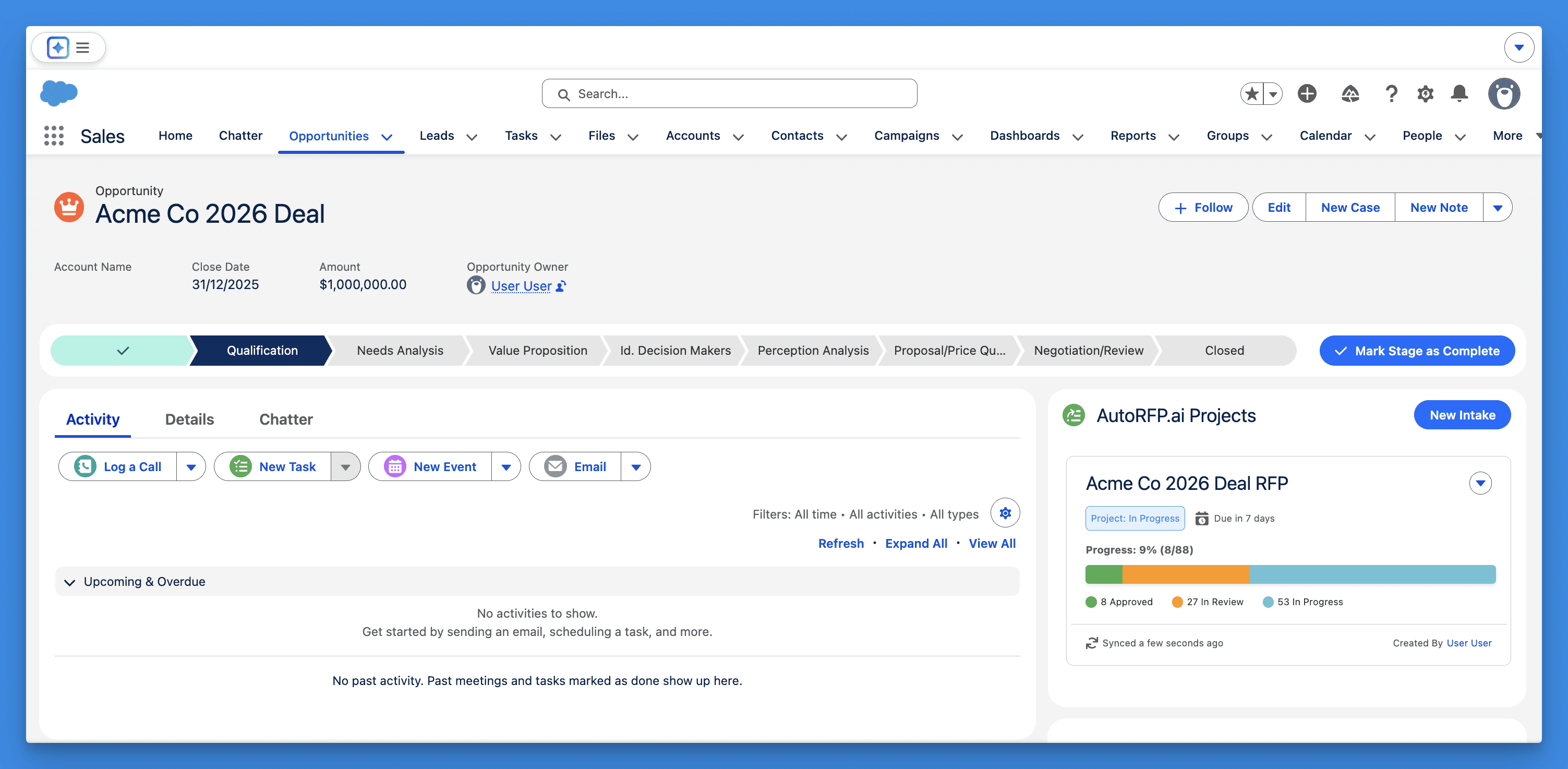Project updates flow between AutoRFP.ai and Salesforce in real time. Status changes, response metrics, owner assignments, and intake decisions stay current across both platforms. Your sales team sees live RFP progress on every Opportunity and Account record without logging into another tool.